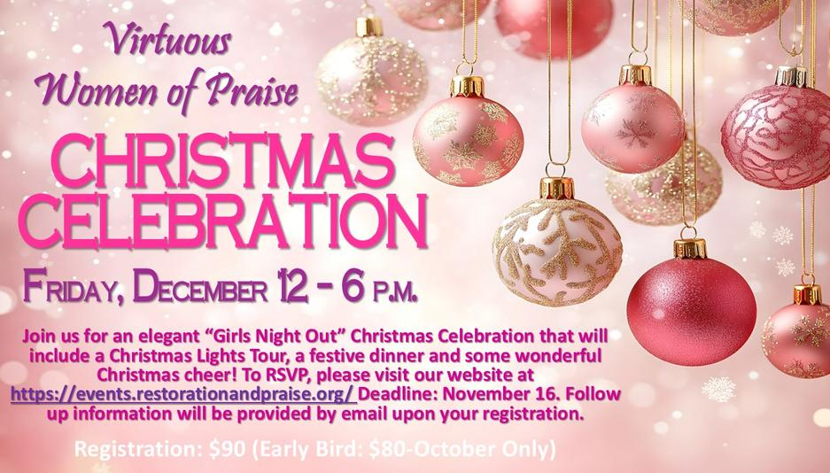 You are cordially invited to attend the Virtuous Women of Praise's Christmas Celebration taking place on Friday, December 12. This will be an elegant “Girls Night Out” event that will include: